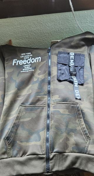 Sudadera con estampado de camuflaje y el texto Freedom. Da poca tolla, yo la uso como S. - Diseño con cremallera completa. - Bolsillos frontales. - Detalle de bolsillo en el pecho con cinta. - Cuello con capucha.