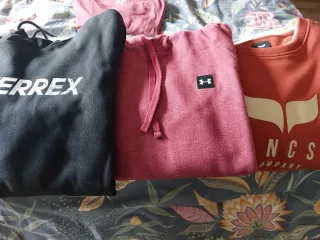 Conjunto de tres sudaderas para hombre. Como nuevas - Sudadera negra con logo Adidas Terrex. Con capucha. - Sudadera rosa con logo Under Armour. Con capucha. - Sudadera naranja Green Coast. Sin capucha. También se venden por separado. Pueden verse en mi perfil. Envio Wallapop o entrega en Alameda de Osuna