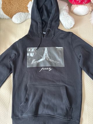 Sudadera negra con un diseño gráfico en la parte delantera. Presenta una imagen de manos rezando y la palabra pray escrita. - Estampado frontal. - Capucha con cordones. - Bolsillo tipo canguro.
