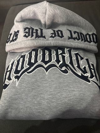 Sudadera Hodrich gris con capucha, ideal para mantenerte abrigado. - Diseño con texto bordado en la capucha y en el pecho #Hodrich