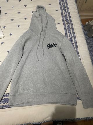 Sudadera gris con capucha y bolsillo delantero. - Diseño con letras blancas y contorno negro. - Tejido suave y cómodo. - Sin cordón en la capucha. - Etiqueta interior cortada.