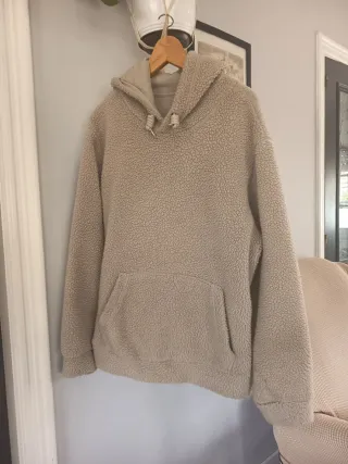 Sudadera de borrego con capucha y bolsillo delantero. - Material suave y cálido. - Diseño con cordones ajustables en la capucha. - Corte holgado.