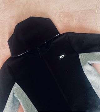 Sudadera con capucha de la marca Tenth, combinando los colores negro y gris. - Diseño moderno con paneles. - Cierre de cremallera frontal. - Logo de la marca en el pecho.