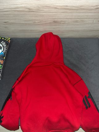 Sudadera con capucha de color rojo, en perfecto estado. Diseño moderno y llamativo. - Talla S. - Precio negociable. - Bolsillo frontal tipo canguro.
