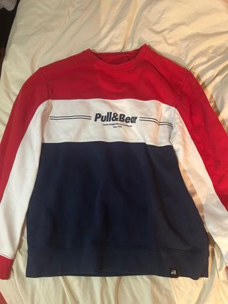 Sudadera de Pull&Bear con diseño tricolor. - Diseño de bloques de color en rojo, blanco y azul marino. - Logo de Pull&Bear en el pecho. - Cuello redondo y manga larga.