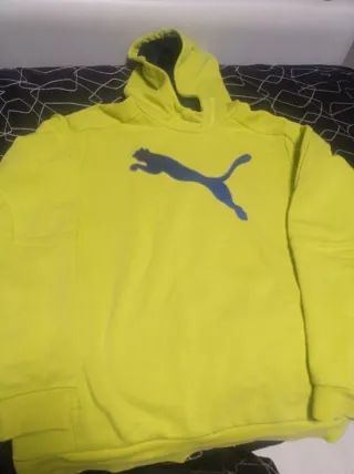 Sudadera con capucha de la marca Puma. - Color verde brillante. - Detalle de logo Puma en azul con rayas. - Capucha con forro interior azul marino. - Bolsillo tipo canguro. Talla 13/14 años XL de niño