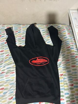 Sudadera con capucha de la marca Corteiz en color negro. Presenta un diseño ovalado en rojo en la parte frontal. - Capucha ajustable. - Bolsillo frontal tipo canguro.