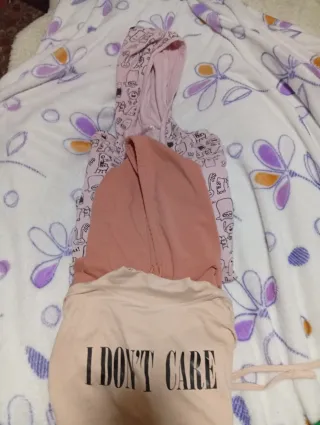 Conjunto de tres sudaderas originales con un diseño divertido y único. - Una sudadera rosa con estampado de monstruos y talla L. - Una sudadera beige con cuello alto y texto. - Una sudadera de color salmón, cortita PRECIO TODOOO