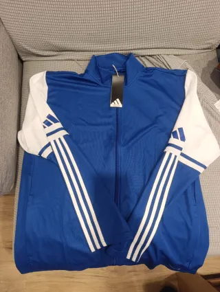 Sudadera deportiva con cremallera. Diseño moderno y llamativo. - Mangas blancas con las icónicas tres rayas de Adidas. - Cuerpo principal en color azul vibrante. - Cierre completo con cremallera frontal. - Cuello alto.