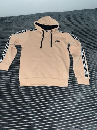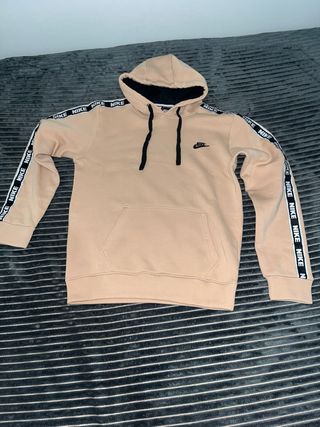 Sudadera con capucha de la marca Nike en color beige. Presenta detalles de la marca en las mangas. - Logo de Nike bordado en el pecho. - Cinta con logo de Nike en las mangas. - Capucha con cordones. - Bolsillo tipo canguro.