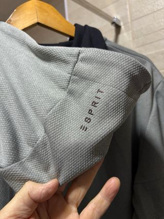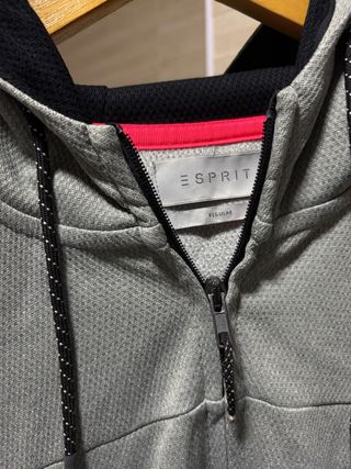 Chaqueta técnica con capucha de la marca Esprit en color gris. Cierre frontal de cremallera completa, capucha con forro de rejilla negra y dos bolsillos laterales con cremalleras selladas. Detalle de logo reflectante en el puño. sin enganches, sin roturas y sin agujeros. • Talla: L (Corte Regular) • Material: 100% Poliéster • Ancho hombros: 51 cm • Largo: 70 cm • Ancho (cintura): 53 cm
