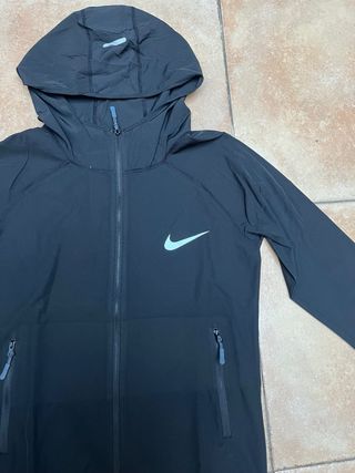 Sudadera deportiva Nike para running. - Diseño con capucha. - Cremallera frontal completa. - Bolsillos laterales con cremallera. - Detalles reflectantes en las mangas.