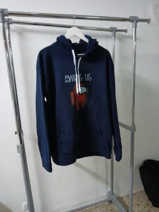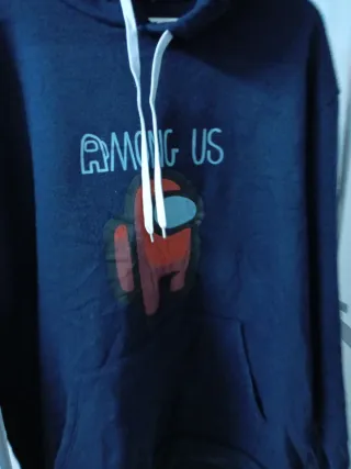 Sudadera con estampado del popular juego Among Us. - Diseño con personaje rojo y texto AMONG US. - Bolsillo frontal tipo canguro. - Capucha con cordones blancos.