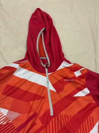 Sudadera con capucha de la marca Head, modelo Vision M Coby Tech Hoody. Presenta un diseño vibrante con bloques de color en tonos naranjas y rojos, y detalles blancos. Esta nueva solamente usada una vez. Talla L. - Diseño con estampado geométrico. - Cremallera frontal parcial. - Capucha ajustable.