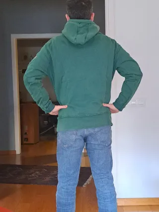 Sudadera con cremallera completa y capucha. Está nueva, no se ha puesto nunca, pero no tiene etiquetas. Color verde oliva. Talla M. - Capucha con cordones ajustables. - Bolsillos laterales. - Cremallera frontal.