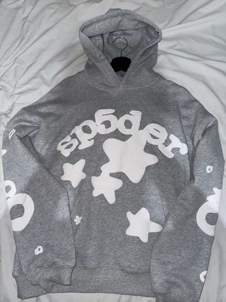 Sudadera con capucha de la marca Sp5der en color gris. Presenta un diseño llamativo con estrellas blancas. - Diseño con estampado de estrellas. - Capucha ajustable. - Bolsillo frontal tipo canguro.