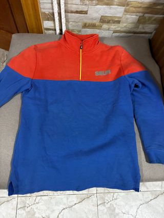 Polar de la marca SEUR con diseño bicolor. - Parte superior en color rojo. - Parte inferior en color azul. - Cuello alto con cremallera. - Logo de la marca en la parte frontal.