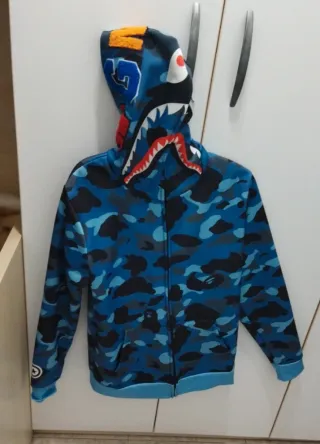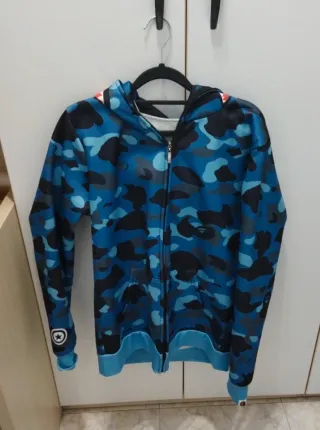 Sudadera con capucha y cremallera. En perfecto estado. La talla es como una M. - Diseño de camuflaje azul. - Estampado de tiburón en la capucha. - Bolsillos delanteros. - Capucha se sube hasta arriba.