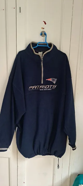 Sudadera deportiva de los New England Patriots de la NFL. - Diseño de cuello alto con media cremallera. - Logo de los Patriots y texto New England bordado en el pecho. - Puños y cintura elásticos. Tiene la cuerda de ajuste de la cadera dada de si y desgastada, aun asi es funcional