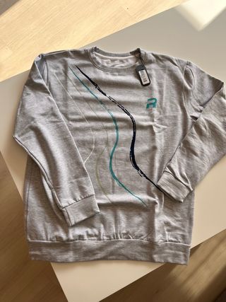 Sudadera Royal Padel, nueva y sin usar. Presenta un diseño moderno con líneas abstractas en tonos azul y verde sobre fondo gris. - Logo de Royal Padel. - Cuello redondo. - Puños y bajo elásticos.