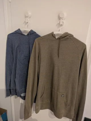 Conjunto de dos sudaderas con capucha y bolsillo canguro: Sudadera azul marca Billabong y Sudadera verde oliva marca Volcom. Son sudaderas más bien finas, para la temporada de primavera. -Sudadera Billabong: composición 70% poliéster, 30% algodón. Talla M/L, 73cm de largo. -Sudadera Volcom: composición 70% poliéster, 30% algodón. Talla L, 75 cm de largo. Están en perfecto estado. Posibilidad de envío / entrega en persona en Distrito Sarrià-Sant Gervasi, Barcelona.