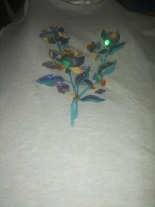Sudadera gris con un bonito bordado floral en la parte delantera. Es una prenda muy versátil y cómoda. - Diseño floral con lentejuelas y detalles bordados. - Cuello redondo. - Manga larga.