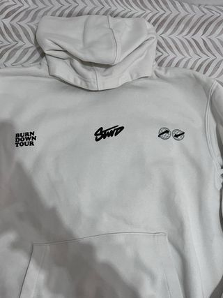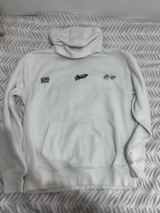 Sudadera con capucha de Pull&Bear en color blanco. Estilo marcas urbanas como Nude Project Talla ancha Tiene una pequeña mancha en la parte posterior de la capucha (utlima foto) Entrego en mano y envío