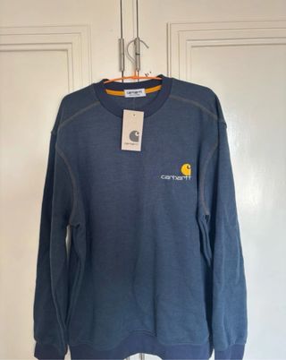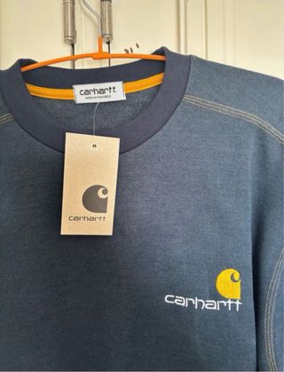 Sudadera Carhartt de color azul, con un diseño clásico y cómodo. - Logo de Carhartt bordado en el pecho. - Costuras visibles en contraste. - Cuello redondo y puños elásticos.