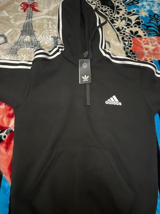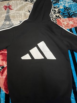 Sudadera con capucha de Adidas, un diseño moderno y cómodo. - Tres rayas blancas en las mangas. - Bolsillo frontal tipo canguro. - Logo de Adidas en el pecho. PRECIO NEGOCIABLE
