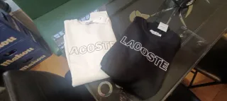 Conjunto de dos sudaderas de la marca Lacoste, una en color negro y otra en blanco. Ambas presentan el logo de la marca. - Sudadera negra con logo blanco. - Sudadera blanca con logo negro.