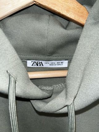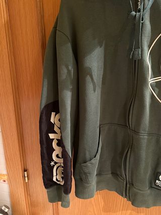 - Color verde. - Bolsillo frontal. - Capucha ajustable con cordones. - Detalle de etiqueta en el lateral.