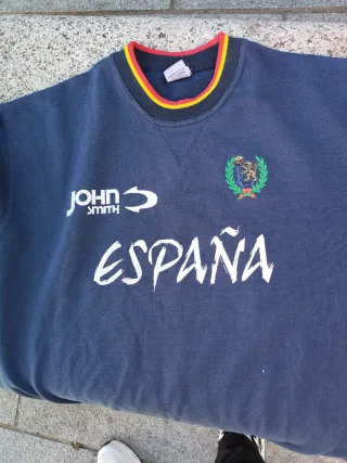 Sudadera vintage de la marca John Smith con diseño de la selección española. - Cuello con detalles de colores. - Escudo bordado. - Estampado ESPAÑA en la parte frontal. - Presenta una tara (ver fotos).