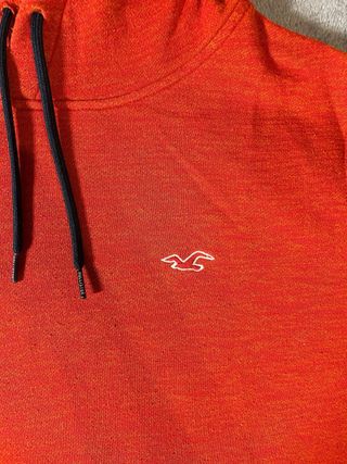 Sudadera con capucha de la marca Hollister original en color naranja. Talla L. Presenta un diseño moderno y cómodo. - Capucha ajustable con cordones. - Bolsillo canguro con cremalleras laterales. - Pequeño logo de la marca bordado en el pecho.
