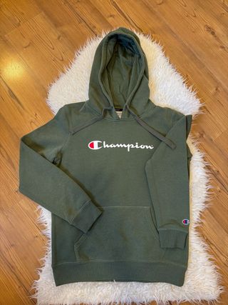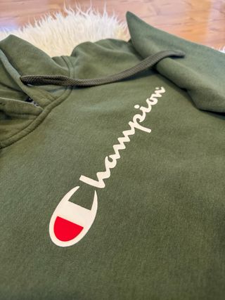 Sudadera con capucha de la marca Champion en color verde oliva. Presenta el logo de la marca en el pecho y un pequeño detalle en la manga. - Logo Champion en el pecho. - Detalle de logo en la manga. - Capucha con cordones. - Bolsillo frontal tipo canguro. Apenas una puesta En la foto principal parece que tuviera una mancha pero así me sale en la foto , no tiene ninguna mancha en realidad , está en perfecto estado! #sudaderachampion #sudaderahombre