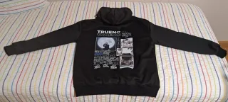 Sudadera con capucha negra. Presenta un diseño gráfico en la parte delantera con imágenes y texto de Trueno. - Diseño frontal con múltiples estampados. - Capucha ajustable. - Manga larga.