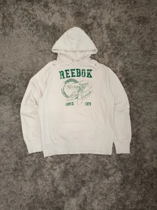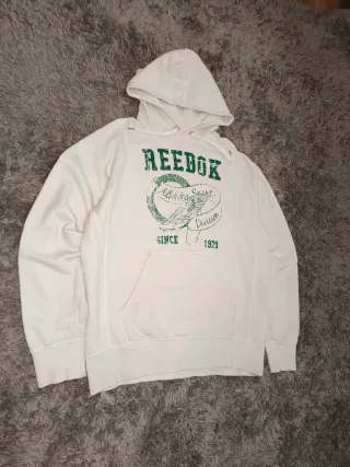 Sudadera blanca Reebok con capucha. El dibujo parece deteriorado, pero es así, dándole un toque desgastado. Está en buen estado general. La ultima foto apenas se aprecia, pero tiene en una zona concreta, un poco color amarillento del paso del tiemo,mínimo que a penas se aprecia, al igual , que una pequeña mancha en un lateral.🤷 Es talla M Hombro 49 Pecho 57 Cintura51,5 Cadera 47 Largo 65 Largo manga 64
