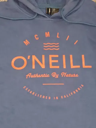 Sudadera original O’Neill de color azul con logo estampado en naranja. Con capucha, bolsillo delantero tipo canguro y tejido cómodo y suave. Ideal para uso diario, estilo casual o deportivo. Es talla L Hombro 46,5 Pecho 60 Cintura 57 Cadera 51 Largo 68 Largo manga 63 Tiene bastantes usos y las letras tienen algunas grietas del desgaste, pero por lo demás, se la puede dar una segunda vida😉