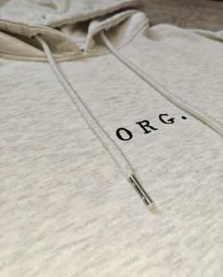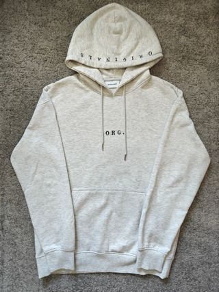 Sudadera original de JACK & JONES en tono gris claro, talla L. Lleva el texto “ORG.” en el pecho y “ORIGINALS” en la capucha, ambos bordados. Interior afelpado, muy cómoda y abrigada. Corte clásico con bolsillo delantero tipo canguro y cordones ajustables. Ideal para looks casuales o para combinar con jeans y zapatillas. En perfecto estado.