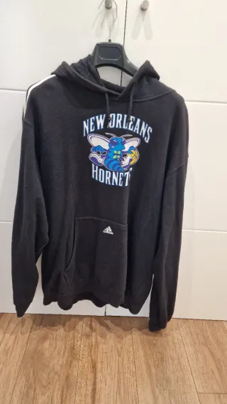 Sudadera con capucha de la marca Adidas, con un diseño inspirado en los New Orleans Hornets. - Logo de los New Orleans Hornets en la parte frontal. - Rayas blancas en las mangas. - Bolsillo tipo canguro. - Comprada en la tienda NBA de NY, es una L pero equivale a una XL Europea.