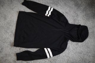Sudadera con capucha de color negro y detalles de rayas blancas en las mangas. En la imagen talla una XL pero es perfecta para un hombre que talla una L, ya que es más pequeña de lo normal. - Diseño con cordones en la capucha. - Bolsillo frontal tipo canguro. - Puños y bajo elásticos.