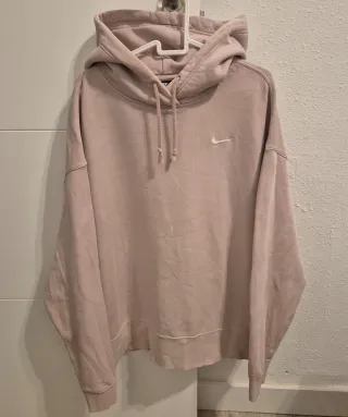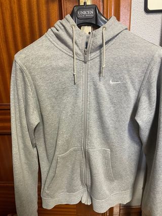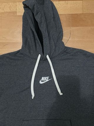 Sudadera Original con capucha de la marca Nike en color gris. Presenta un diseño moderno y cómodo. Sudadera comprada en Octubre de 2025, se ha usado un par de veces y no tiene ningún desgaste, está como nueva. Es bastante calentita. - Logo de Nike en el pecho. - Bolsillo tipo canguro. - Capucha con cordones ajustables.