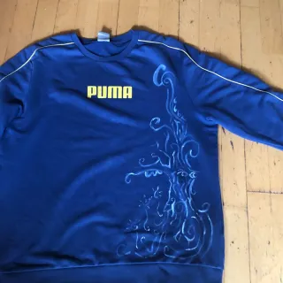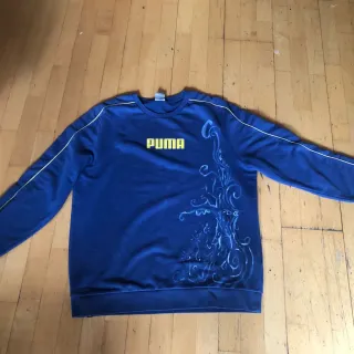 Sudadera azul de la marca Puma con un diseño personalizado. - Logo de Puma en amarillo. - Detalle de diseño ornamental en blanco en el lateral. - Ribetes blancos en mangas y cuello.