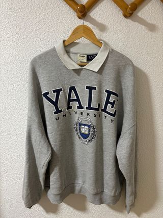 Sudadera con cuello tipo polo y el logo de Yale University. Color gris con logo frontal bordado. Corte oversize ideal para estilo vintage / streetwear / Y2K. Muy cómoda y en excelente estado. Talla: XL