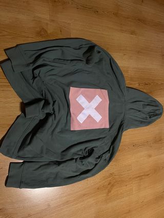 Sudadera con un diseño llamativo en la espalda. - Estampado de una X blanca sobre un recuadro rosa. - Color verde principal de la prenda. - Mangas largas y capucha.