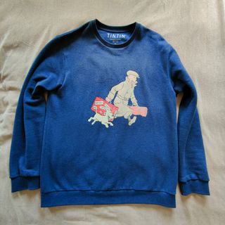 Sudadera con un divertido estampado de Tintin y Milú preparándose para un viaje. El diseño muestra a Tintin con su maleta y a Milú corriendo a su lado. - Estampado de ciudades en la maleta: Shanghai, Hong Kong, Singapur, Bombay y Port Said. - Talla XXL - Algodón 100%