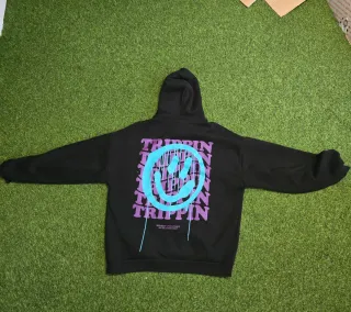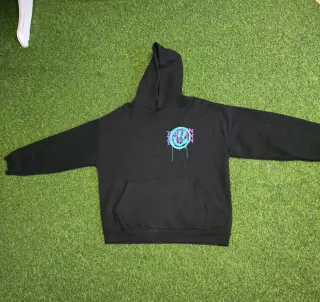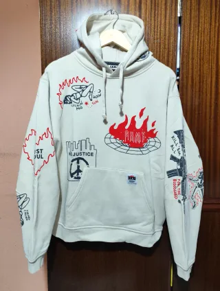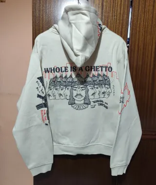 Sudadera negra con un diseño llamativo en la espalda y detalles de salpicaduras de pintura Medidas: Ancho 64cm Alto 71cm Hombro 66cm Largo brazo 56cm