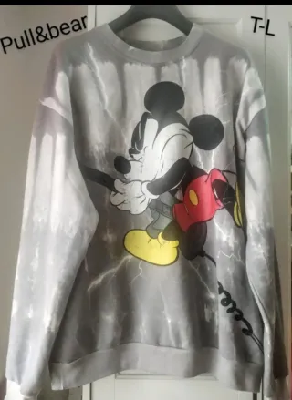 Sudadera sin capucha de Pull&bear, talla L, Diseño Disney, con estampado de Mickey Mouse "efecto tie-dye", en tonos grises y blancos. Buen estado.