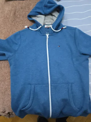 Sudadera con capucha de la marca Tommy Jeans. Calentita. Las medidas muestran que es M aunque señale L la etiqueta. Es original como todo lo que vendo - Cierre de cremallera frontal. - Bolsillos tipo canguro. - Cordones ajustables en la capucha.