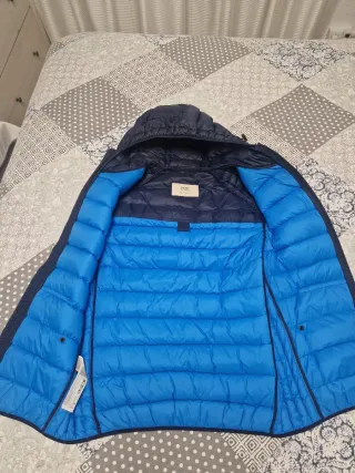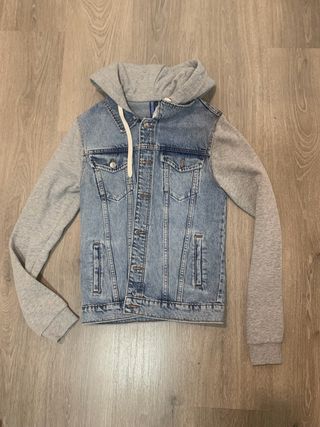 Chaqueta vaquera con mangas de sudadera y capucha. - Diseño combinado de denim y tejido de algodón. - Cierre de botones metálicos. - Bolsillos en el pecho y laterales - Chaqueta de hombre talla XS, en perfecto estado.