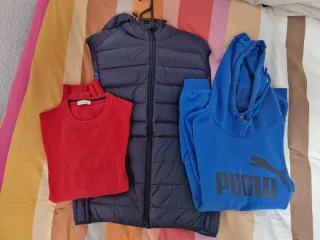 Conjunto de tres prendas de ropa. - Chaleco acolchado azul marino. - Sudadera con capucha azul con logo Puma. - Jersey de punto rojo con diseño.
